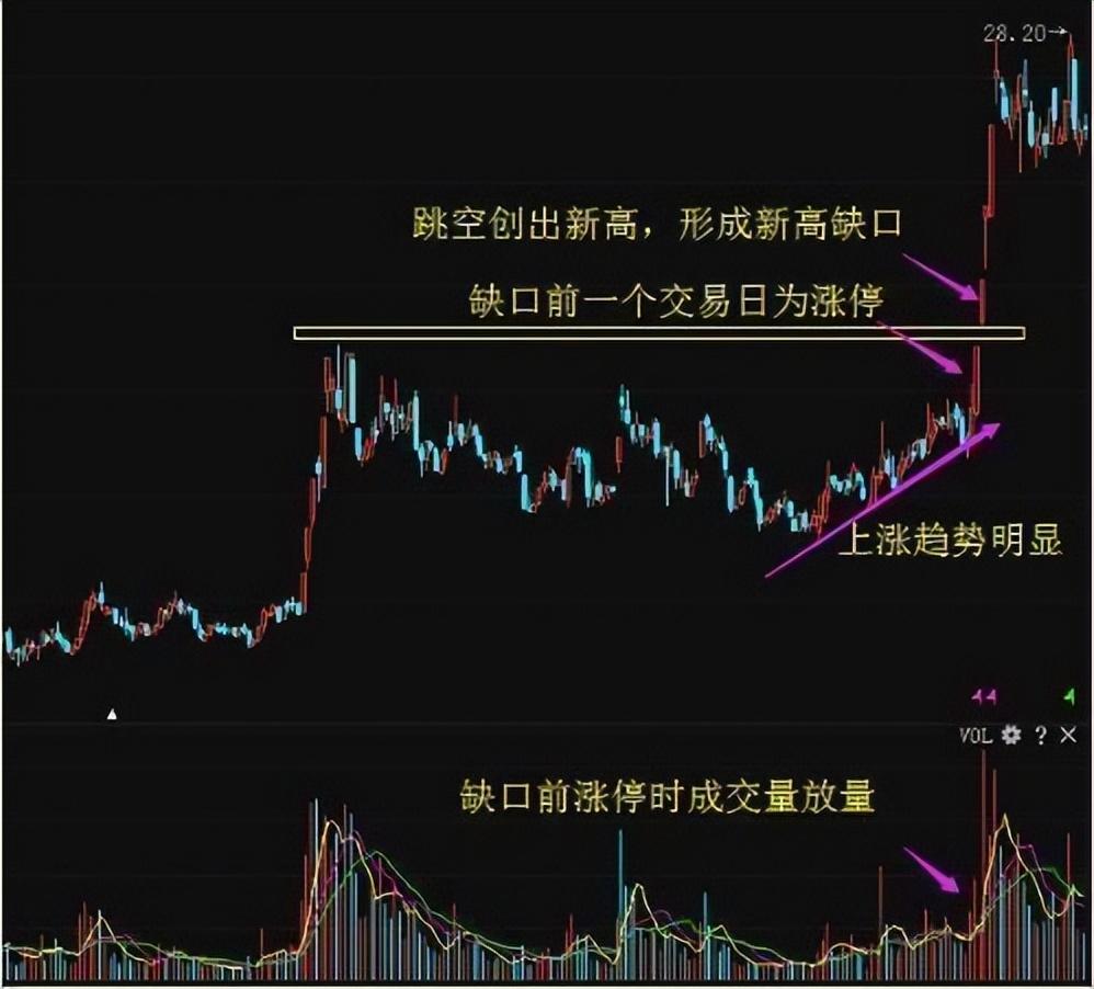 1、缺口出现前一个交易日为涨停K线或带上影线的K线,且涨停对应的量能明显放大;