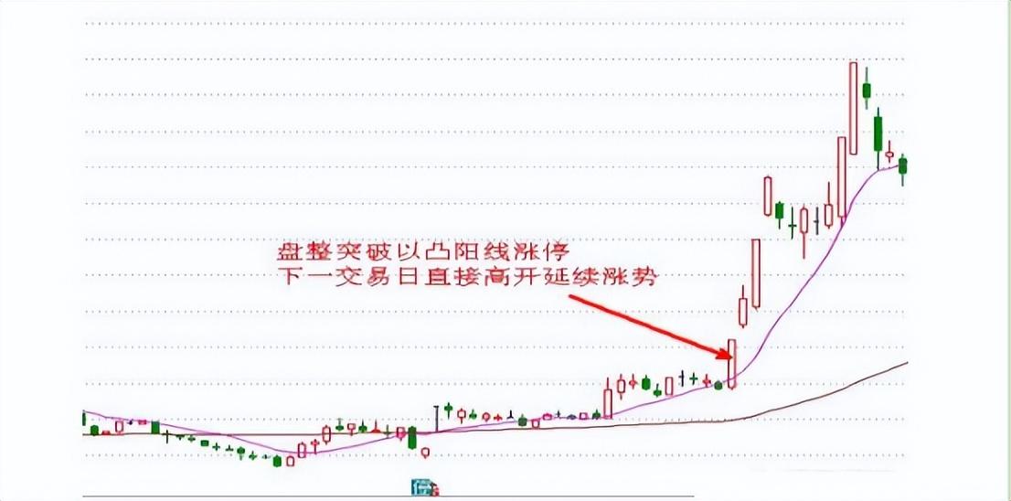 当日K线盘整上破,直接以凸阳线收成,第二个交易跳空高开,延续涨势,继续强势涨停,并且这种涨势延续了四个交易日。