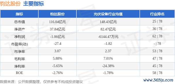 钧达股份2025年一季报显示,公司主营收入18.75亿元,同比下降49.52%;归母净利润-1.06亿元,同比下降636.04%;扣非净利润-2.17亿元,同比下降27.1%;负债率78.95%,投资收益413.06万元,财务费用5490.17万元,毛利率5.88%。钧达股份(002865)主营业务:光伏电池的研发、生产与销售。