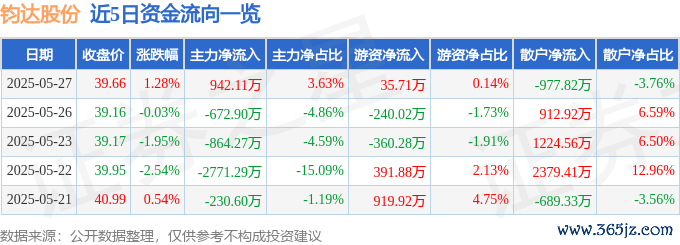5月27日的资金流向数据方面,主力资金净流入942.11万元,占总成交额3.63%,游资资金净流入35.71万元,占总成交额0.14%,散户资金净流出977.82万元,占总成交额3.76%。