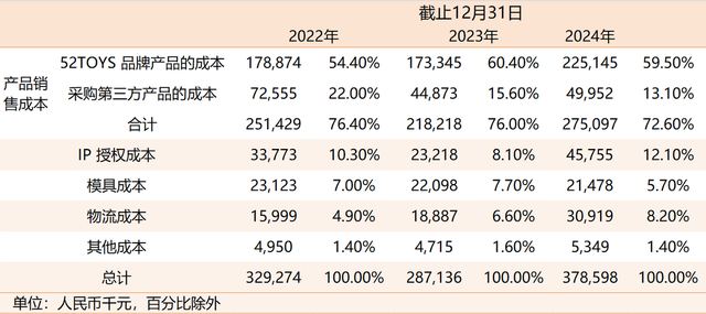 而造成52TOYS亏损的原因,主要是高昂的销售成本和运营费用。招股书显示,2024年,公司销售成本为3.79亿元,占比超同年收入的六成。