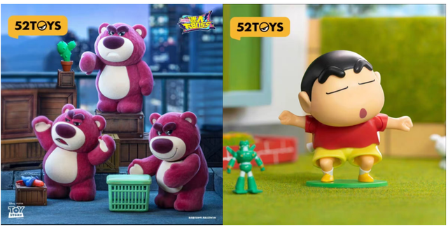 首先,授权IP的合作并非独家,这意味着同样的IP形象可能会出现在其他品牌的产品中。例如,52TOYS的蜡笔小新、迪士尼草莓熊等授权IP虽然销量可观,但在名创优品等品牌的门店里,消费者也能买到这些IP的相关产品。