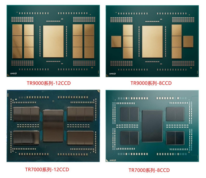 从CCD/IOD的布局来看的话,其实AMD锐龙线程撕裂者9000系列与上代相比也是有明显变化的。大家可以看到,无论是最多12个CCD/96核的版本还是最多8个CCD/64核的版本,CCD排列的方式都有所变化,而新的排列方式更有利于优化核心之间的延迟。此外,以我们测试的AMD锐龙线程撕裂者9980X/9970X为例,它们都使用了8个CCD的设计,虽然32核的AMD锐龙线程撕裂者9970X只使用了4个CCD,但它仍然拥有全部的8个CCD,多出来的CCD作用是保证电气平衡。最后,散热器部分,它们都可以使用TR5扣具散热器,处理器包装盒中也附带了对应的扣具,可以支持绝大部分Asetek方案水冷散热器。