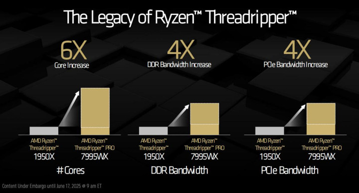 线程撕裂者(线程撕裂者)系列可以说是AMD历代处理器产品中的传奇,从初代的锐龙线程撕裂者1950X到上代锐龙线程撕裂者PRO 7995WX,核心数量增长了5倍;内存带宽增长了3倍;PCIe带宽也提升了3倍。并且在这样的进化过程中,将对位的竞品直接挤出了历史舞台,在这个市场中达到了“独孤求败”的境界。