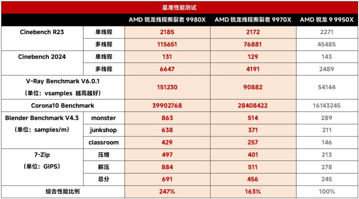首先来看看基准测试部分的情况。在针对3D模型渲染输出的Cinebench R23里,AMD锐龙线程撕裂者9980X拿到了115651分的多线程成绩,这已经是上代64核对应型号开启PBO后才能触及到的水平了,相比消费级的锐龙9 9950X更是提升了154%之多。AMD锐龙线程撕裂者9970X的Cinebench R23多线程得分则为76881分,相比锐龙9 9950X也提升了69%。Cinebench 2024的情况也差不多,两者分别相对锐龙9 9950X提升了167%和68%。V-Ray和Corona 10的情况也和两个Cinebench测试相仿。在Blender渲染测试中,AMD锐龙线程撕裂者9980X/9970X的优势就更夸张了,AMD锐龙线程撕裂者9980X达到锐龙9 9950X的3倍左右,AMD锐龙线程撕裂者9970X也有接近1.8倍,HEDT平台对上消费级平台完全就是碾压。7-Zip也是典型的多线程应用,AMD锐龙线程撕裂者9980X/9970X也基本上达到了锐龙9 9950X的3倍/1.8倍水平。