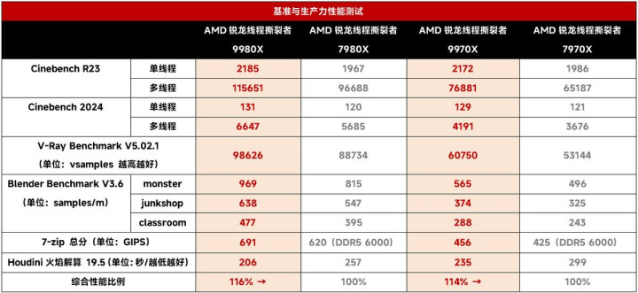 我们也用去年AMD锐龙线程撕裂者7000X首发测试的数据来对比了一下,看看相对上代同核心数的型号,AMD锐龙线程撕裂者9980X/9970X的提升有多大。可以看到,得益于Zen5架构带来的IPC提升、SoC内存控制器的改进,AMD锐龙线程撕裂者9980X基准测试的综合成绩领先AMD锐龙线程撕裂者7980X大约16%,而AMD锐龙线程撕裂者9970X大约领先AMD锐龙线程撕裂者7970X的幅度为14%,这样看来其实也是非常符合Zen4到Zen5架构升级的幅度的。此外,我们也可以看到,在解算这类应用中,AMD锐龙线程撕裂者9980X/9970X的提升尤其大,AMD锐龙线程撕裂者9970X甚至和核心数比自己多一倍的AMD锐龙线程撕裂者7980X都快差不多了,可见Zen5架构确实强大。