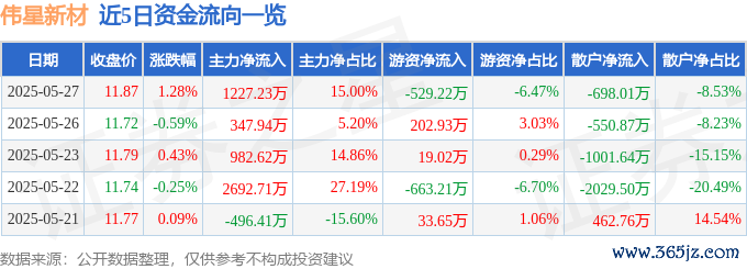 5月27日的资金流向数据方面,主力资金净流入1227.23万元,占总成交额15.0%,游资资金净流出529.22万元,占总成交额6.47%,散户资金净流出698.01万元,占总成交额8.53%。